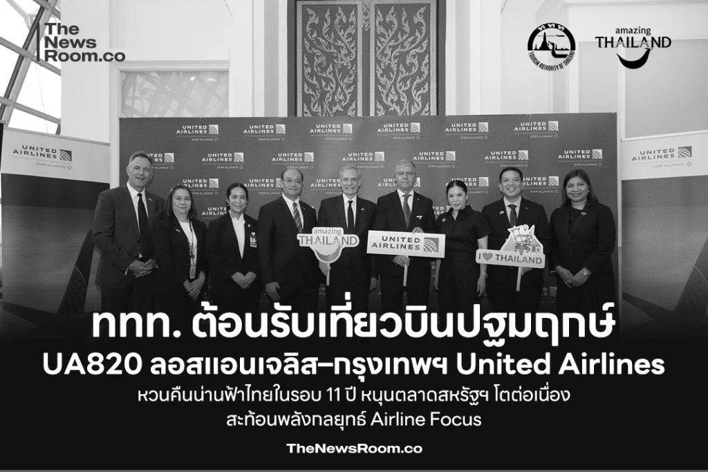 ททท. ต้อนรับเที่ยวบินปฐมฤกษ์ UA820 ลอสแอนเจลิส–กรุงเทพฯ United Airlines หวนคืนน่านฟ้าไทยในรอบ 11 ปี หนุนตลาดสหรัฐฯ โตต่อเนื่อง สะท้อนพลังกลยุทธ์ Airline Focus
