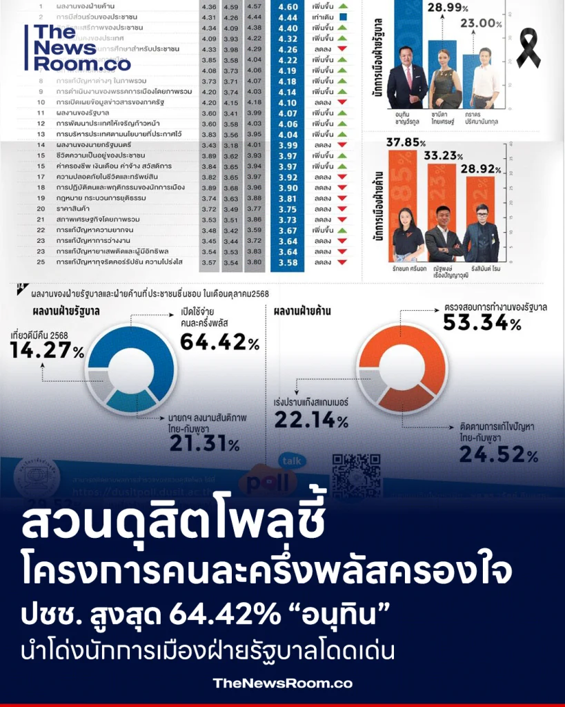 ในด้านบุคคล “นายอนุทิน ชาญวีรกูล” นายกรัฐมนตรีและรัฐมนตรีว่าการกระทรวงมหาดไทย ได้รับคะแนนสูงสุดในกลุ่มนักการเมืองฝ่ายรัฐบาล ร้อยละ 48.01 จากบทบาทการนำประเทศบนเวทีโลก ทั้งการประชุมเอเปค การลงนามปฏิญญาสันติภาพไทย–กัมพูชา และนโยบายกระตุ้นเศรษฐกิจฐานราก “คนละครึ่งพลัส” ที่ประชาชนตอบรับอย่างกว้างขวาง